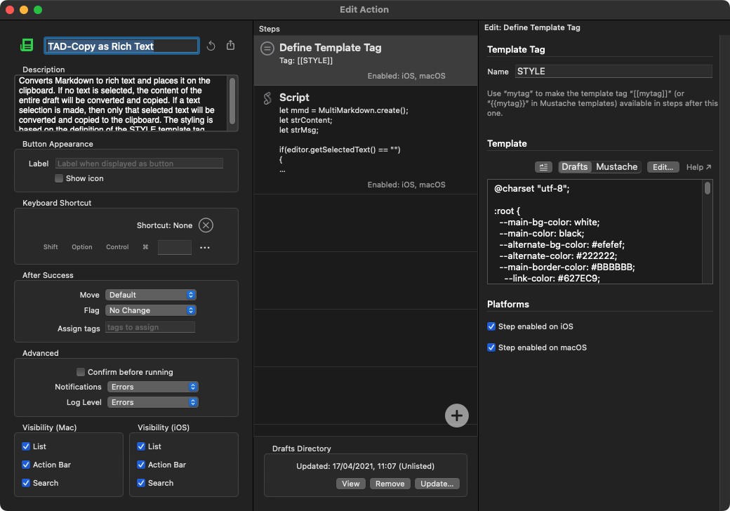 Now you don’t have to add this every time if you create your own action. You could hard code it into the action, or you could do like I did in the "TAD-Copy As Rich Text” and keep it in a tag definition in the action to make it a little easier to maintain.